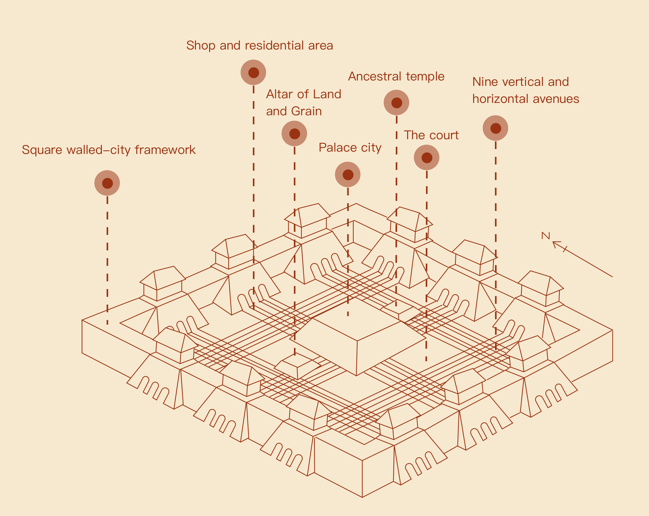 The “Kao Gong Ji (Record of Trades)” in Zhou Li (Rites of Zhou) describes the planning pattern of the ideal capital city in ancient China as follows, “When craftsmen build a capital city, they must follow the following rules: The city should be square in shape, with nine-li on each side, and three gates on each side of the city wall. The capital should have nine north-south roads and nine east-west roads, each of which can accommodate nine vehicles side by side. An ancestral temple should be placed on the left (outside the palace gates), and an altar of land and grain should be placed on the right; the court should be placed in front of the emperor’s residence, and the market should be located behind the palace. Both the court and market should be a square of 100 paces.”
