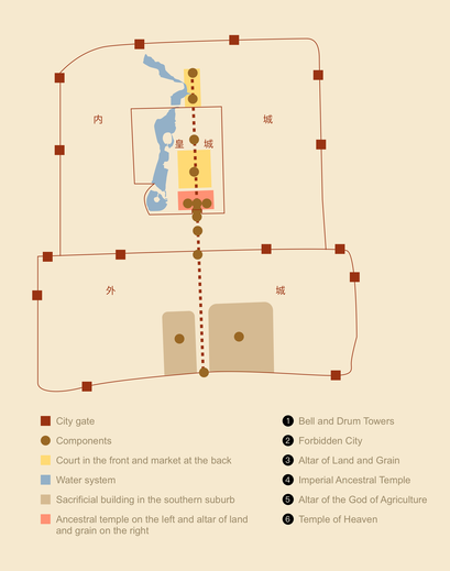 The Beijing Central Axis layout pattern fully demonstrates the ideal capital city planning paradigm prescribed in the Kao Gong Ji. It takes the north-south and centered historical road as the skeleton, linking the well-arranged buildings and urban spaces with different functions. Located in the middle of the Beijing Central Axis, the outer part of the Forbidden City, the Tiananmen Gate, the Upright Gate, and the ceremonial hall complex in the Outer Court area of the Forbidden City form “the imperial court in the front with a market at the back,” as prescribed in Kao Gong Ji. The Bell and Drum Tower and the surrounding commercial areas at the north end of the central axis were where the markets in the inner city of Beijing were located during the Yuan, Ming, and Qing dynasties. They represent the “market in the back” concept. The Imperial Ancestral Temple, located southeast of the Forbidden City, and the Altar of Land and Grain to the southwest form the pattern of “an ancestral temple on the left and an altar of land and grain on the right.”